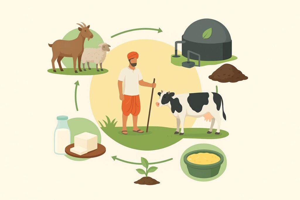 Located in Dehradun, our model integrates goats, sheep, cattle, renewable biomass energy, and cooperative-based farmer engagement.