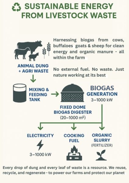 Harnessing Biogas from Cows, Buffaloes, Goats  and Sheep for clean energy and organic manure — all within the farm. No external fuel. No waste